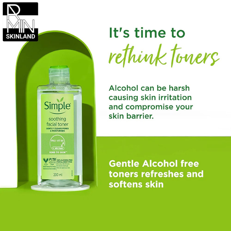 در فرمولاسیون این تونر از الکل، پارابن، مواد شیمایی مضر، عطر، رنگ و … استفاده نشده است و هیچ گونه آسیبی به پوست نمی رساند. تونر Simple برای انواع پوست، حتی پوست های حساس قابل استفاده می باشد.