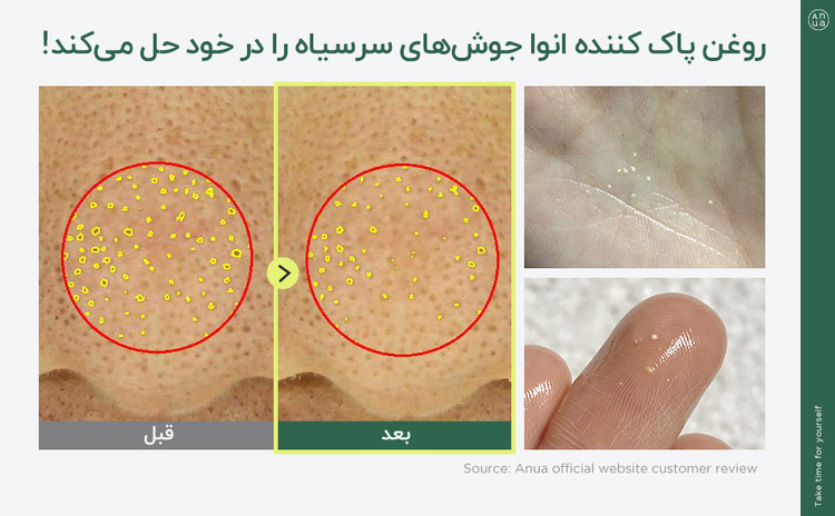 ⚪️روغن پاک کننده آنوا 18.88 درصد از جوش های سر سیاه و 20.09 درصد از جوش های سر سفید را بهبود می بخشد. پس از ماساژ روغن ميتوانيد آنها را روی انگشتان خود ببینید.