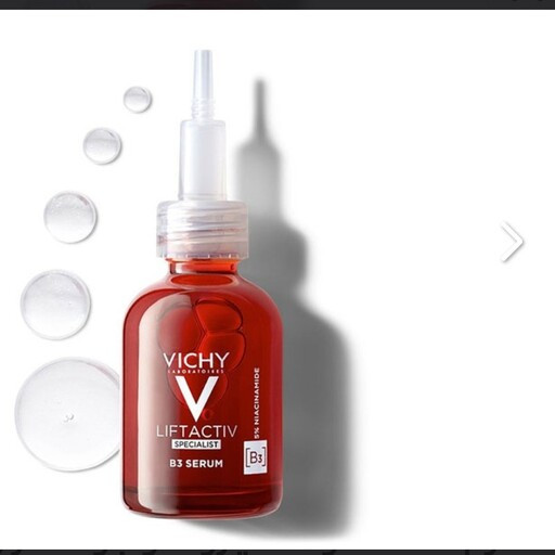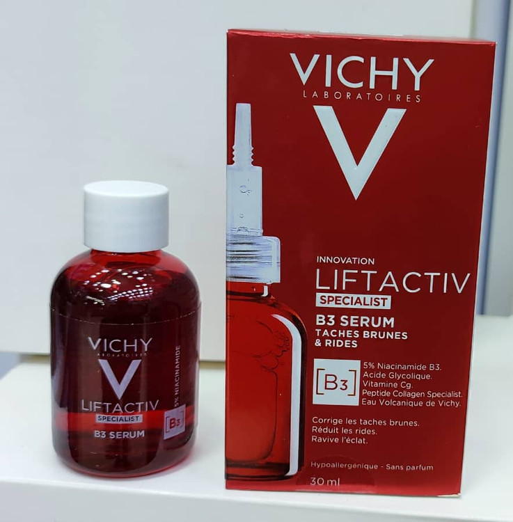 سرم ضد لک و ضد چروک B3 لیفت اکتیو ویشی (Vichy LiftActiv B3 Serum Dark Spots & Wrinkles) سرم جوانساز از برند ویشی دارای 5 درصد نیاسینامید می باشد که این ترکیب فرم محلول ویتامین b3 است و دارای اثرات انتی اکسیدانی است و در برابر رادیکال آزاد و آلودگی از پوست محافظت می کند. همچنین نیاسینامید مهار کننده رنگدانه های پوست است و خاصیت ضدلکی عالی دارد